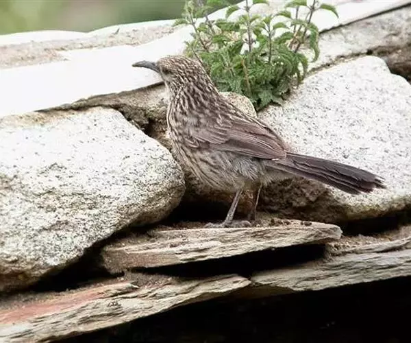 玉山噪鹛中等体型的褐色鸟类。白色长眉纹及髭纹显著;顶冠灰而具白色的鳞状斑纹;脸侧及颏褐色,…