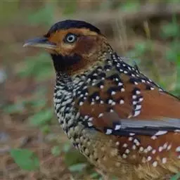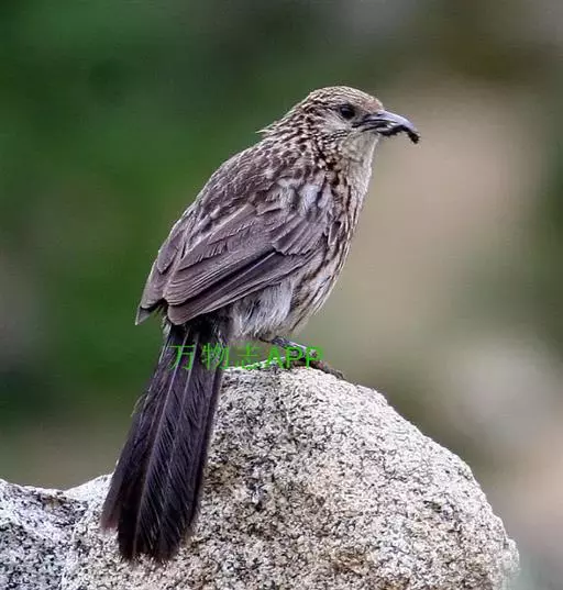 大噪鹛:中型鸟类,体长32-36厘米。额至头顶黑褐色,背栗褐色满杂以白色斑点,…