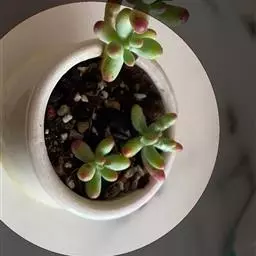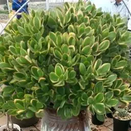 植株密集丛生,肥厚的绿白色叶对生且紧密排列,叶面粗糙有微细颗粒。叶缘强光下会微红,无叶尖,叶片轻微有皱褶。花多簇生,小花乳白色,五角型的微型花瓣。