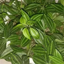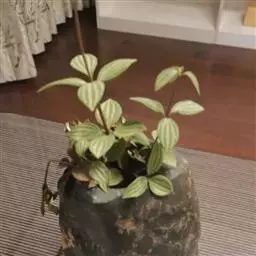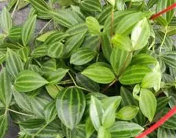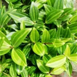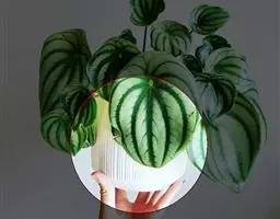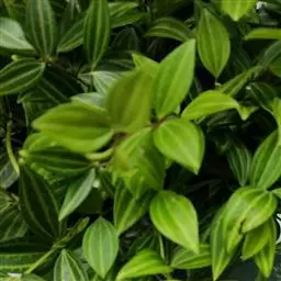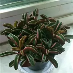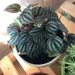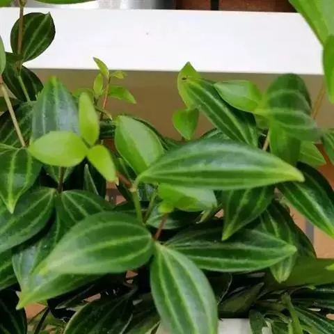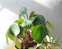 西瓜皮椒草 又称西瓜皮豆瓣绿、西瓜皮、银白斑椒草。植株无茎或具短茎,叶近基生,具红色长柄,叶片着生密集,盾形或倒卵形,厚实而光滑,半革质,叶面浓绿色,具半月形的银白色条纹。穗状花序,细小的花朵白色。