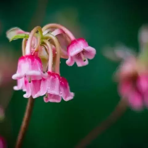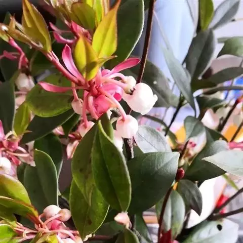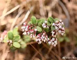 花数朵组成顶生伞形花序;花梗长8-12毫米;花萼盘状,小,绿色,上部5裂,裂片三角形,长2-3毫米;花冠白色,坛形,长8-9毫米,宽6-7毫米,近口部缢缩,5裂,裂片卵状三角形,长1-1.2毫米;雄蕊10,花药具2芒;花柱丝状,内藏。