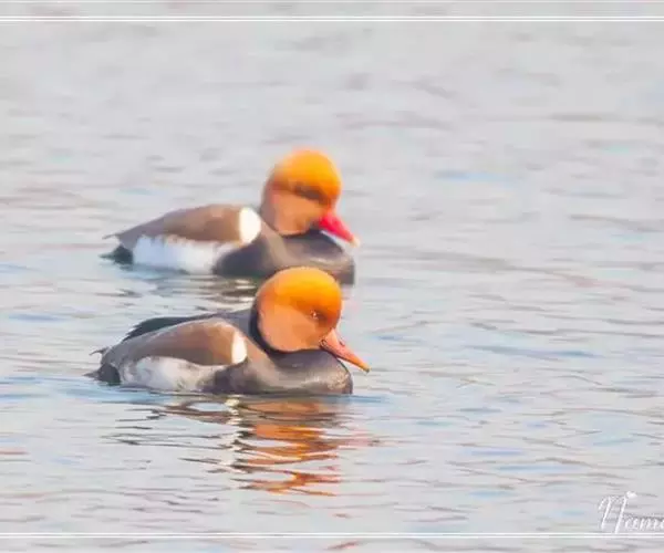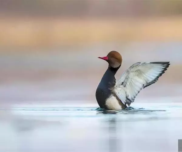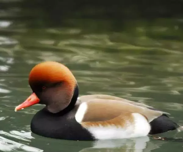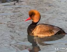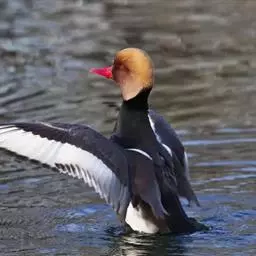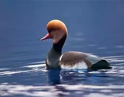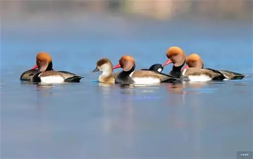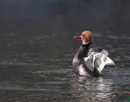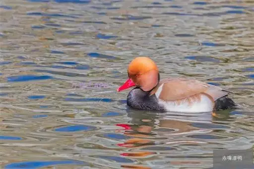 赤嘴潜鸭(学名:Netta rufina)俗称大红头,是大型鸭类,个体比绿头鸭小,体长45-55厘米,体重1千克左右。雄鸟头浓栗色,具淡棕黄色羽冠。上体暗褐色,翼镜白色,嘴赤红色。下体黑色,两胁白色,特征极明显,野外容易辨别。雌鸟通体褐色,头的两侧、颈侧以及颏和喉灰白色,飞翔时翼上和翼下大型白斑极为醒目。栖息在开阔的淡水湖泊、水流较缓的江河、河流与河口地区,也常出现在公路两侧的水泡中,特别是有水边植物和水较深的淡水湖泊最为喜欢。主要通过潜水取食,也常尾朝上、头朝下在浅水觅食。觅食多在清晨和黄昏。食物主要为水藻、眼子菜和其他水生植物的嫩芽、茎和种子,有时也到岸上觅食青草和其他一些禾本科植物种子或草子。主要分布于欧洲中部、亚洲中部,从多瑙河流域经土耳其、黑海、里海、吉尔吉斯到西西伯利亚,往南到蒙古西部、伊朗、叙利亚北部,也有少量繁殖在西班牙东部、法国南部、欧洲北部,一直到丹麦、荷兰。