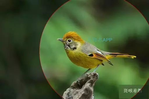 斑喉希鹛(学名:Minla strigula)小型鸟类,体长14~17厘米。头具羽冠,前额和头顶羽冠金黄褐色,头侧灰黄色具黄色眼圈。上体灰橄榄绿色,外侧飞羽表面橘黄色、基部具黑色翼斑;内侧飞羽表面淡灰色具黑色亚端斑和白色端斑。尾羽黑色,基部栗色,羽缘和羽端黄色。颊黑色,颏橘黄色,喉白色具黑色横斑,其余下体淡黄色。特征突出,容易识别。中国还未见有与之相似的种类。