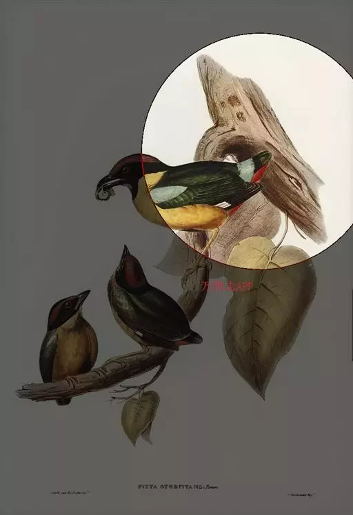 雌性成鸟 与雄鸟相似,但额和头顶无血红色,代之则是黑色,其余的则完全相同。