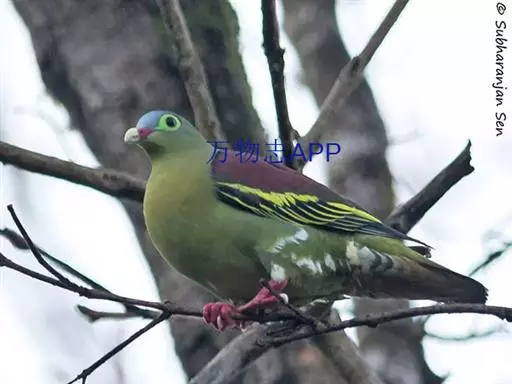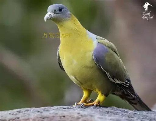 为国内最大的一种绿鸠;第三枚飞羽的内翈亦有凹入处,但前三枚飞羽先端形甚狭尖;羽色与一般绿鸠迥异;上体以黄橄榄绿色为主,下体以淡蓝灰色为主;两性均有紫红色翅斑而无背斑,雌雄同色。
