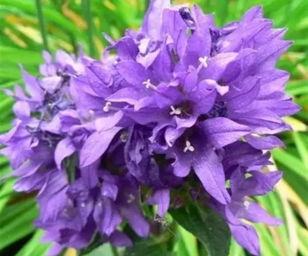 北疆风铃草(学名:Campanula glomerata L.subsp. glomerata):植株高20-85厘米,茎不分枝。茎生叶具长柄,长卵形至心状卵形,边缘均具尖锯齿;茎叶几乎无毛至疏被白色硬毛。花数朵集成头状花序。花萼裂片钻形;花冠紫色、蓝紫色或蓝色,管状钟形,分裂至中部。蒴果倒卵状圆锥形。种子长矩圆状,扁。花期7-9月。
