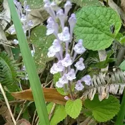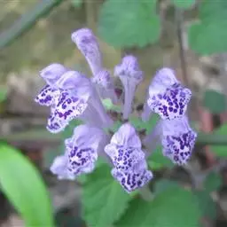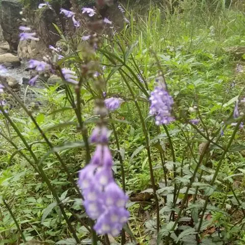 冠檐紫红色,冠管淡红或白色;花长1.5-1.7厘米,外被微柔毛;花冠管长1—1.2厘米,前方基部曲膝状,向上增大;冠檐上唇盔状,直伸,卵圆形,先端微凹,下唇中裂片三角状卵圆形,先端微凹,侧裂片卵圆形。花丝中部以下被纤毛。