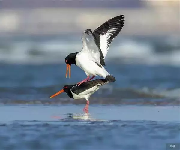 在越冬期间蛎鹬经常发出低沉的“哼唱”,有的还会有精彩的“蝶飞”表演,这实际上是在与同伴联络或在确立自己的主导地位及领域范围。