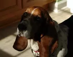 这个品种的重要特征之一,长、下垂、且折叠(主要的边缘折叠或卷起,呈 奥达猎犬 窗帘状)。耳朵位置低,甚至低于眼睛,贴着头部,向前拉伸的话,能延伸到鼻尖。耳朵上覆盖着大量毛发。