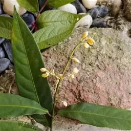 圆锥花序顶生,花梗长达21厘米,花多,较密集,黄白色,径4-5毫米,萼片与花瓣均5,椭圆形,萼片宿存,花盘盘状,心皮3,分离。蓇葖果长1-2厘米,每一花发育为1-3个蓇葖,果皮软革质,紫红色,有纵脉纹,种子近圆形,径约5毫米,假种皮肉质,黑色,有光泽。