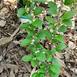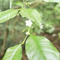 满树星:落叶灌木,高2m。有长枝和短枝,枝灰褐色,长枝被柔毛,并有皮孔。叶互生;叶柄长1-1.2cm,有短毛;叶片薄纸质,倒卵形,长2-8cm,宽1-3cm,先端渐尖,基部楔形,边缘具锯齿,两面有短柔毛,侧脉3-4对,网脉不明显。花序单生长枝或短枝叶腋或鳞片腋内;花白色,有香气,4-5数;雄花序具1-3花,花梗无毛,花萼直径2.5mm,裂片三角形,花瓣圆卵形,雄蕊与花冠等长;雌花序具单花,花梗稍短,花萼、花冠似雄花,子房卵形,柱头厚盘状。果实球形,直径7mm,有网状条纹和槽,内果皮骨质,花期6月,果期7月。