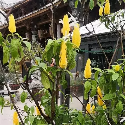 金脉爵床又称金叶木,为爵床科黄脉爵床属多年生常绿观叶植物。金脉爵床为直立灌木状,盆栽种植株高一般50-80厘米。多分枝,茎干半木质化。叶对生,无叶柄,阔披针形,长15-30厘米、宽5-10厘米,先端渐尖,基部宽楔形,叶缘锯齿;叶片嫩绿色,叶脉橙黄色。夏秋季开出黄色的花,花为管状,簇生于短花茎上,每簇8-10朵,整个花簇为一对红色的苞片包围。