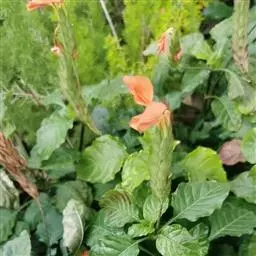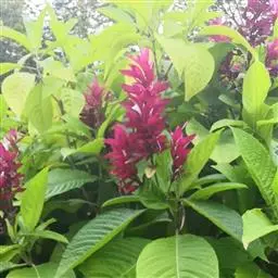 金脉爵床又名金叶木,为爵床科黄脉爵床属多年生常绿观叶植物。株高可达150cm,但盆栽株高一般为50~80cm。叶对生,无叶柄,阔披针形,长15~30cm、宽5~10cm,先端渐尖,基部宽楔形,叶缘有钝锯齿,叶片嫩绿色,叶脉粗壮呈橙黄色。夏秋季开出黄色的花,花为管状,长4~5cm,簇生于短花茎上,每簇 8~10朵,整个花簇为1对鲜红色的苞片包围。
