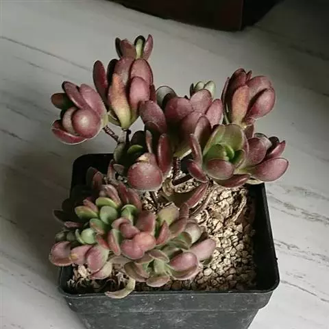 多年生肉质草本植物,植株呈亚灌术状高约60厘米,具小分枝,茎肉质以后稍木质化。肉质叶灰绿至浅绿色,叶缘稍具红色,交互对生,卵圆状三角形,无叶柄,基部连在一起,幼叶上下叠生,战叶上下有少许间隔。叶长1.5~2.5厘米,宽0.9~1.3厘米,花白色,4~5月开放。