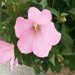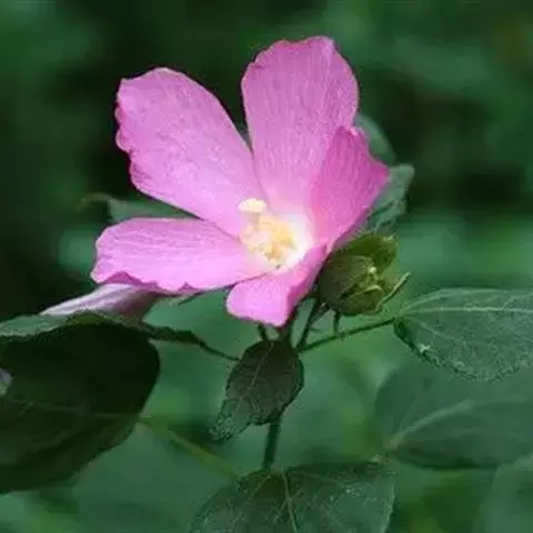 木槿(学名:Hibiscus syriacus Linn.):落叶灌木,高3-4米,小枝密被黄色星状绒毛。叶菱形至三角状卵形,长3-10厘米,宽2-4厘米,具深浅不同的3裂或不裂,先端钝,基部楔形,边缘具不整齐齿缺,下面沿叶脉微被毛或近无毛。花单生于枝端叶腋间,花萼钟形,长14-20毫米,密被星状短绒毛,裂片5,三角形;花朵色彩有纯白、淡粉红、淡紫、紫红等,花形呈钟状,有单瓣、复瓣、重瓣几种。外面疏被纤毛和星状长柔毛。蒴果卵圆形,直径约12毫米,密被黄色星状绒毛;种子肾形,背部被黄白色长柔毛。花期7-10月。