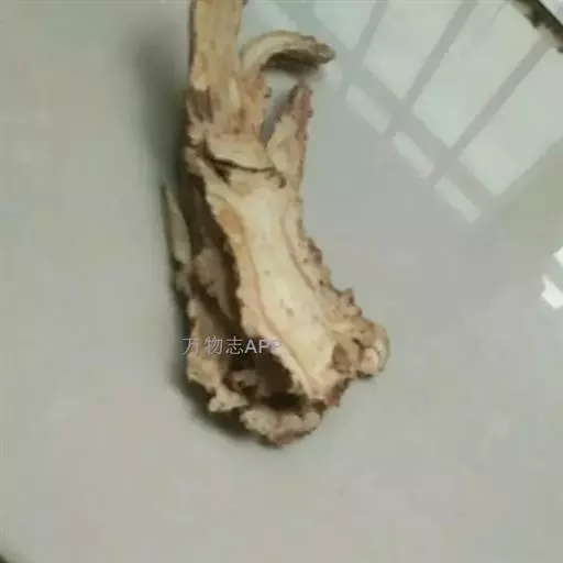 正品药用前胡。其主根呈不规则圆锥形,长3-6厘米,直径1.8-2厘米。表面棕褐色,有纵皱纹,顶端有叶基痕,下部生支根数条,支根长6-9厘米、直径0.5-0.8厘米。表面有纵皱纹及横向皮孔状的疤痕。质较硬易折断,折断面皮部棕褐色,木部黄棕色,也有的断面色较浅。具芳香气但与当归香气不同,味略辛辣。