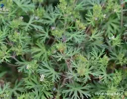 茎纤细,长约30cm,直径lmm~2mm,节间长,具纵皱纹,质较坚脆,易折断,断面纤维性,空心。叶对生,叶片卷曲皱缩,质脆易碎,湿润展平后为五角状圆形,3~5全裂,全裂片又再涂羽裂,中央全裂片有长柄,侧生全裂片有短柄。花紫红色。果实长圆形,长约2cm,有宿存的花柱及红紫色花萼,成熟后5裂,各与l枚种子相连,并向外反卷或卷曲成螺旋形。无臭,味淡。以色灰绿、果实多,无根及泥土者为佳。