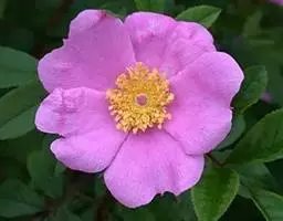 直立灌木,高约1.5米;小枝通常有大小不等的皮刺并混生刺毛;小叶3-5;小叶片革质,卵形或宽椭圆形,长2-6厘米,先端圆钝或短渐尖,基部圆形或近心形,有重锯齿,稀为单锯齿,齿尖常带腺,上面暗绿色,有褶皱,下面淡绿色,被柔毛;小叶柄和叶轴有刺毛和腺毛;托叶大部贴生于叶柄,离生部分卵形,边缘有腺毛。花单生,稀3-4,无苞片;花梗直立粗壮,被腺毛;花直径4-7厘米;萼筒和萼片外面有腺,萼片常有多数裂片;花瓣粉红色或深红色。果近球形或梨形,亮红色,萼片脱落。