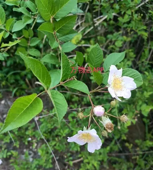 攀援灌木;小枝圆柱形,通常无毛,有短、粗稍弯曲皮束。小叶5-9,近花序的小叶有时3,连叶柄长5-10厘米;小叶片倒卵形、长圆形或卵形,长1.5-5厘米,宽8-28毫米,先端急尖或圆钝,基部近圆形或楔形,边缘有尖锐单锯齿,稀混有重锯齿,上面无毛,下面有柔毛;小叶柄和叶轴有柔毛或无毛,有散生腺毛;托叶篦齿状,大部贴生于叶柄,边缘有或无腺毛。花多朵,排成圆锥状花序,花梗长1.5-2.5厘米,无毛或有腺毛,有时基部有篦齿状小苞片;花直径1.5-2厘米,萼片披针形,有时中部具2个线形裂片,外面无毛,内面有柔毛;花瓣白色,宽倒卵形,先端微凹,基部楔形;花柱结合成束,无毛,比雄蕊稍长。果近球形,直径6-8毫米,红褐色或紫褐色,有光泽,无毛,萼片脱落。