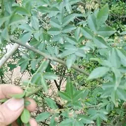 幼枝密被针刺及宽扁大形紫色皮刺,小叶片上面叶脉明显,…