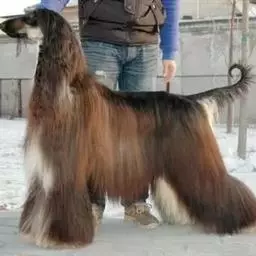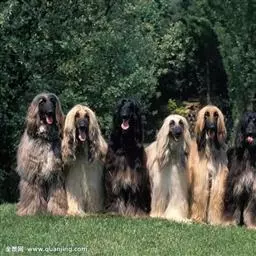 阿富汗猎犬全身披丝绢状的长毛,毛色鲜艳,呈多种颜色,背中线附近毛短,…