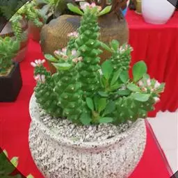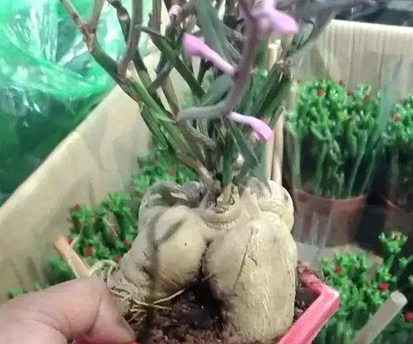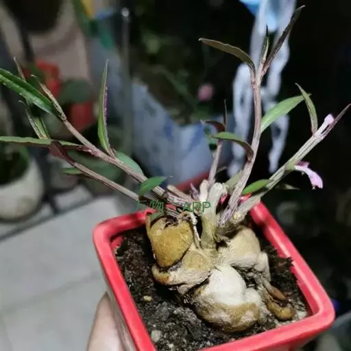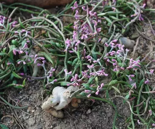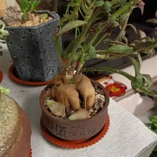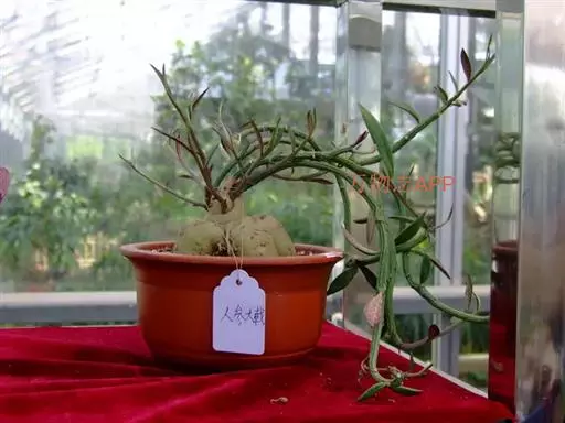 人参大戟,是典型块茎状多肉植物的代表性种类之一。黄褐色人参状茎基膨大多肉,顶生灰绿色柔枝,青绿色狭形小叶交互对生,枝端缀满桃色小花。形态精巧灵秀、古咄奇巧。可与柔美雅秀、风姿宜人的“人参榕”盆景相媲美,深受爱好者的青睐。