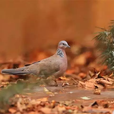 山斑鸠,是鸽形目鸽鸠科斑鸠属鸟类,又名金背斑鸠、棕背斑鸠、山鸠、金背鸠、麒麟斑、麒麟鸠、东方斑鸠、绿斑鸠、山鸽子。山斑鸠颈侧具明显黑白色条纹的块状斑,上体深褐色、具扇贝状斑纹,羽缘棕色,尾羽近黑色,下体多偏粉色。虹膜黄色,喙灰色,脚粉色。山斑鸠是留鸟,在中国常见且分布广泛。此外,还分布于不丹、尼泊尔、巴基斯坦、印度、日本等国。栖息于针阔混交林、季风常绿阔叶林、果园及农耕区,多成对活动于开阔农耕区、村舍、寺院周围及防火林带。取食于地面,主要觅食植物种子、果实、嫩芽等,也吃昆虫。山斑鸠飞翔时鼓翼快速,叫声为反复而低沉的“咕咕咕”声。繁殖期在4-7月,营巢于林中树上,通常一年繁殖2窝,窝卵数2枚,由雌雄亲鸟轮流孵卵,孵化期18~19天。山斑鸠的肉、卵可食,肉入药可益气明目、强筋壮骨,治久病气虚、衰弱无力、两目昏暗等病症。山斑鸠啄食杂草种子,对农田清除杂草有益;但有时也刨食农作物及树的种子。山斑鸠