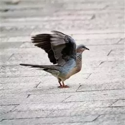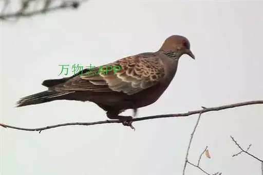 欧斑鸠体长27厘米,是一种体型略小的粉褐色斑鸠。颈侧具多黑白色细纹的斑块,翼覆羽深褐,…