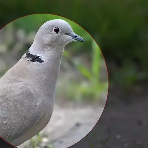 大小和野鸽相似,但体稍侯长些,通体深灰,颈基部两侧有一黑色羽斑羽缘镶以新月型白色。尾羽黑色,但外侧稍短者是明显白端,在降落地面尾展开时成为可见。