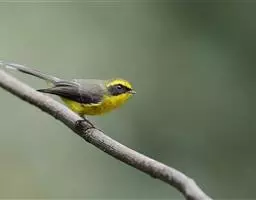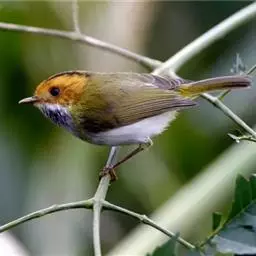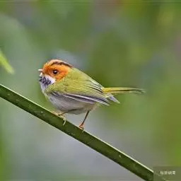 棕脸鹟莺:体长10厘米,是一种色彩亮丽而有特色的莺鸟。头栗色,具黑色侧冠纹。上体绿,腰黄色。下体白,…