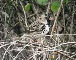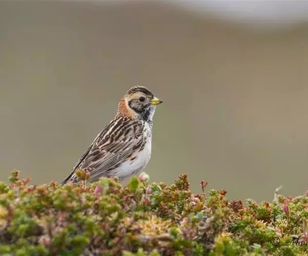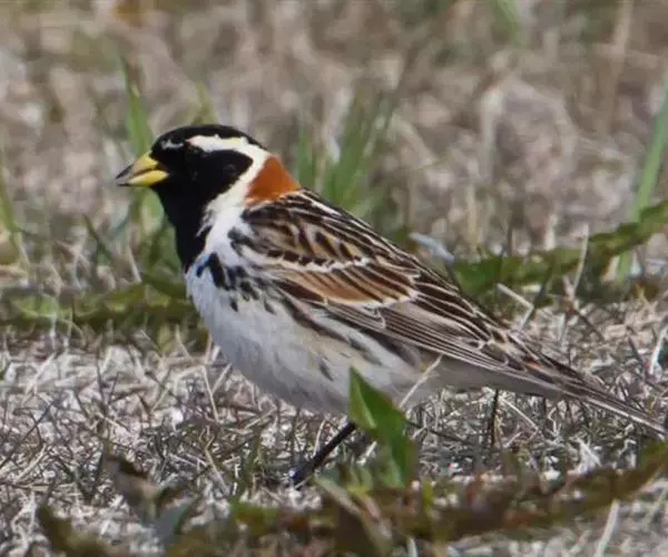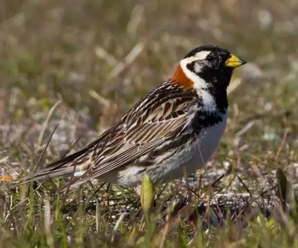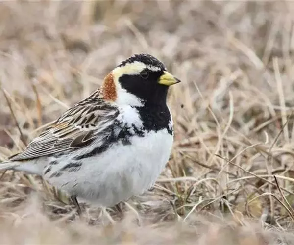 铁爪鹀(学名:Calcarius lapponicus):共有5个亚种。体重20-34克,体长140-178毫米,属大型鹀类。头、颈、喉和胸侧均黑色;眉纹及颈侧白色;下颈及翕浓栗赤色,背部锈赤色发达,并具黑色纵斑;上胸黑,下体余部白色;两胁有纵斑。后趾爪特长;雄鸟的头、喉和胸呈黑色。体形大小和鹀属相似。嘴形似鹀属呈圆锥形;翅长而尖,前三枚初级飞羽约相等并最长,翅式:2=3>4;尾长等于翅的三分之二;跗蹠长于中趾和爪;后爪长而细,近乎直,约等或长于后趾;前三趾的诸爪甚平扁。