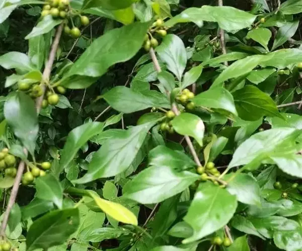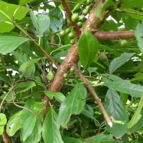 核果球形,黑色,直径5-6毫米,具2分核,基部有宿存的萼筒;果梗长1-1.2厘米;种子卵圆形,黄褐色,背侧有与种子等长的狭纵沟。花期5-6月,果期7-10月。