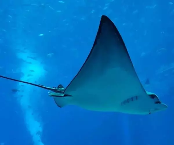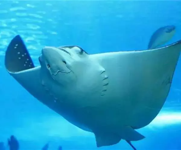 蝠鲼又名魔鬼鱼,因它们的游姿与夜里飞行的蝙蝠有些相似而得名,是软骨鱼纲、蝠鲼科几种海产属鱼类的统称。蝠鲼的体型呈不规则的椭圆形,体盘一般50~100厘米左右,最大可达8米以上,重达3吨。2008年8月,我国海南的一位渔民就曾捕获了一条1500千克重的超级“魔鬼鱼”。身体扁平,宽大于长,一头宽大平扁,吻端宽而横平,胸鳍肥厚如翼状,头前有胸鳍分化出的两个突出的头鳍,位于头的两侧,尾细长如鞭,有一个小型的背鳍。有些种类的尾部有一个或多个毒刺,口宽大,牙细而多,像铺石一样排列,上、下颌具牙带,但上颌可能没有牙齿,鼻孔位于口前两侧,出水孔开口于口隅,喷水孔为三角形,较小,位于眼后,距眼有一相当距离,鳃孔宽大,腰带深弧形,正中延长尖突。蝠鲼背面多为黑色或灰蓝色,腹面灰白且散布着零星的深色斑点,体型就像一张巨大的毯子,再加上其身体后部有一条又圆又细的尾巴,就像是一只“海上风筝”。蝠鲼有洄游的习惯,所以人们不会在一个地方常年见到它。每年的6~7月,蝠鲼会洄游到福建、浙江沿海。8~9月,它们又会游到黄海,10~11月,就会游回浙江沿海,12月到次年2~3月沿原来路线洄游南下,在我国福建、浙江和黄海一带可见到它们的踪影 。