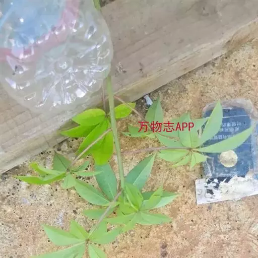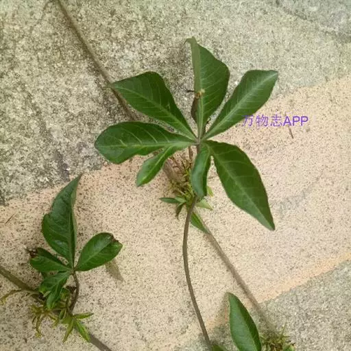 叶掌状5深裂或全裂,裂片卵状披针形、卵形或椭圆形,中裂片较大,长4-5厘米,宽2-2.5厘米,两侧裂片稍小,顶端渐尖或稍钝,具小短尖头,基部楔形渐狭,全缘或不规则微波状,基部1对裂片通常再2裂;叶柄长2-8厘米,基部具小的掌状5裂的假托叶(腋生短枝的叶片)。