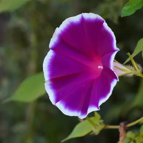 聚伞花序腋生,花序梗长2-8厘米,具1-3花,或偶有3朵以上;苞片及小苞片均小,鳞片状,早落;花梗长0.5-2厘米,有时具小疣状突起;萼片稍不等长,外方2片较短,卵形,长5-6毫米,外面有时有小疣状突起,内萼片稍宽,长7-9毫米,萼片边缘干膜质,顶端钝圆或具不明显的小短尖头;花冠紫红色、紫色或淡红色、偶有白色,漏斗状,长5-7厘米;雄蕊不等长,花丝基部稍扩大下延贴生于花冠管基部以上,被毛;子房无毛,花柱纤细,长于雄蕊,柱头2球形。
