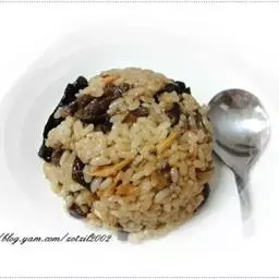 糯米淘洗干净后,浸泡一晚上后,控干水分,上笼蒸约40分钟;紫菜和虾米泡软,并将紫菜切成细末。
