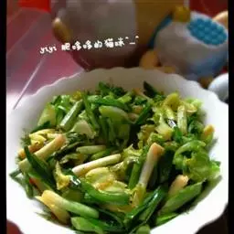 第六步:将青蒜苗放入锅入翻炒匀均,放入少许鸡精。关火淋入香油翻炒均匀即可。
