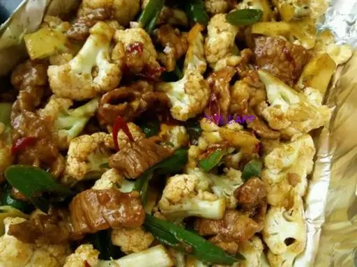 3、肉片稍挂浆不仅可以保持肉片的软嫩,还可使最后成品中的汤汁更好的包裹在菜花上,增加口感。