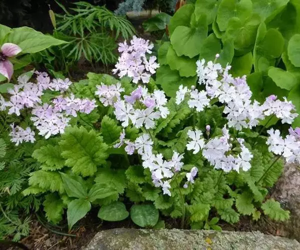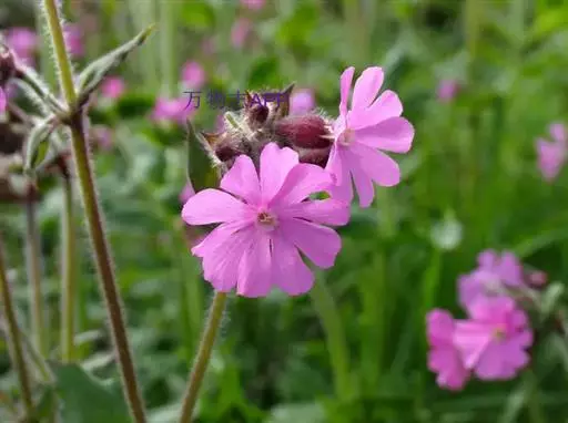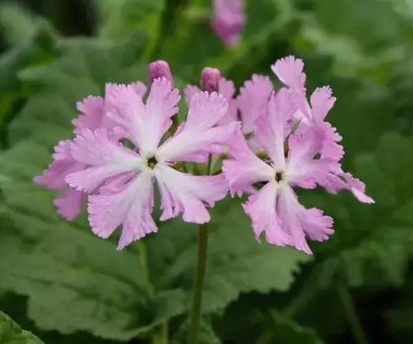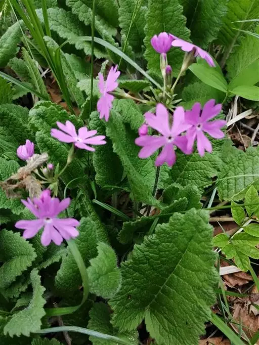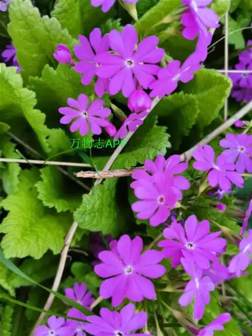 樱草(学名:Primula sieboldii E. Morren):春花科报春花属多年生草本,根状茎倾斜或平卧,叶片卵状矩圆形至矩圆形,稀近圆形或截形,边缘圆齿状浅裂,上面深绿色,下面淡绿色,两面均被灰白色多细胞长柔毛,花葶高可达30厘米,伞形花序顶生,苞片线状披针形,花萼钟状,花冠紫红色至淡红色,稀白色,蒴果近球形,长约为花萼的一半。5月开花,6月结果。