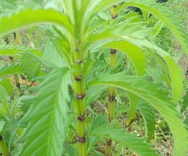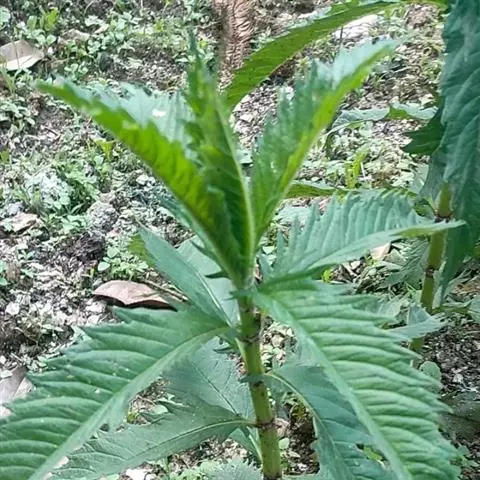 叶具极短柄或近无柄,长圆状披针形,多少弧弯,通常长4-8厘米,宽1.2-2.5厘米,先端渐尖,基部渐狭,边缘具锐尖粗牙齿状锯齿,两面或上面具光泽,亮绿色,两面均无毛,下面具凹陷的腺点,侧脉6-7对,与中脉在上面不显著下面突出。轮伞花序无梗,轮廓圆球形,花时径1.2-1.5厘米,多花密集,其下承以小苞片;小苞片卵圆形至披针形,先端刺尖,位于外方者超过花萼,长达5毫米,具3脉,位于内方者,长2-3毫米,短于或等于花萼,具1脉,边缘均具小纤毛。