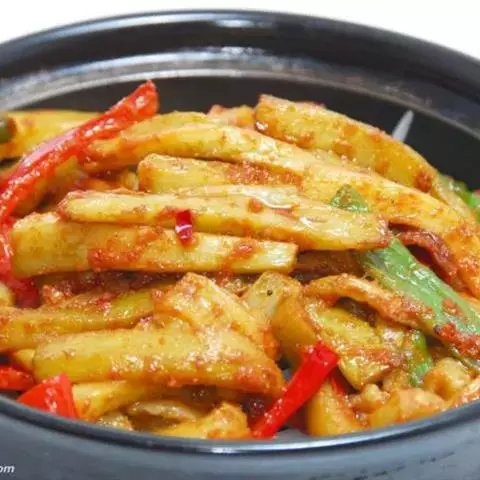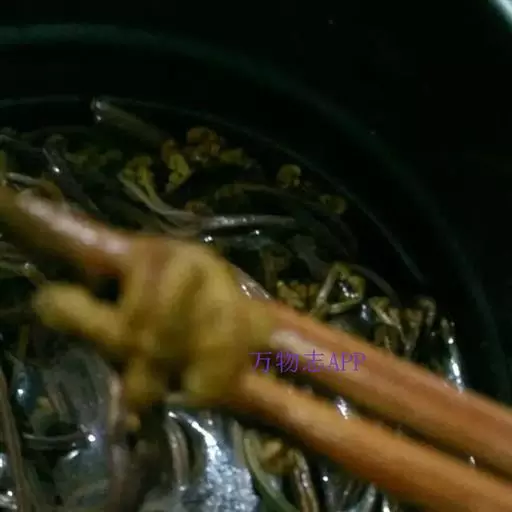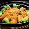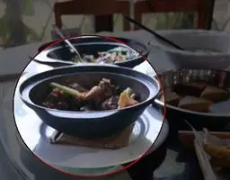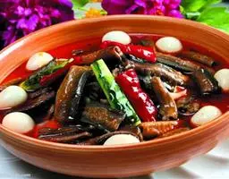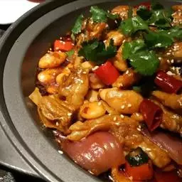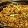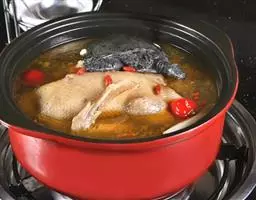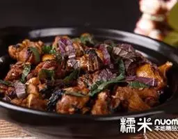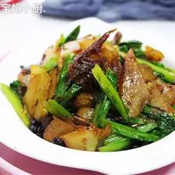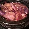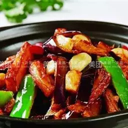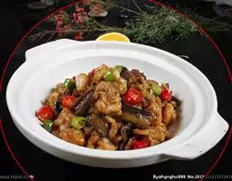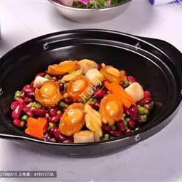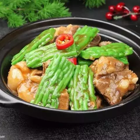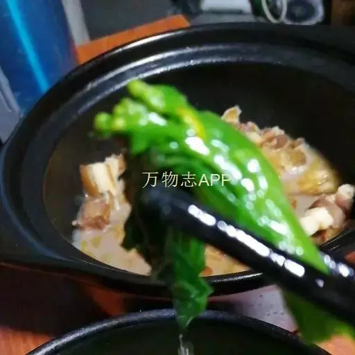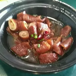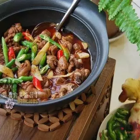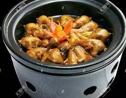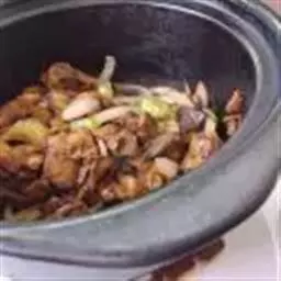 4. 烧热瓦缸下油,放入青蒜、肉排同爆,下些老抽,一碗清水,适量味精、糖、盐同煲之,煲十分钟后,加入已熟之粟子焖片刻即成。