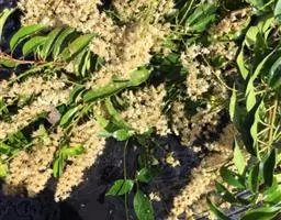花单性,雌雄异株或杂性,黄绿色,有芳香,花瓣缺,排列成顶生下垂的圆锥花序,花序梗有疏柔毛,长10-20稀(30-60-80)厘米;雄花比雌花稍大,直径约1.2厘米;萼片3-6片,通常6片,覆瓦状排列,长卵形,长约6毫米,宽约3毫米,有密毛;花丝丝状,被软毛,花药椭圆形,基部着生,侧裂,有退化子房;雌花比雄花稍小,直径约9毫米;萼片3-6片,通常6片,卵形,长约4毫米,宽约2.5毫米,外面有密毛,内面有疏毛;子房上位,圆球形,无毛,花柱5或6,向外平展,柱头倒卵圆形,退化雄蕊多数,花丝短或缺。浆果成熟期紫红色,扁圆形,高(长)3-5毫米,直径5-7毫米,宽过于长,果梗细小,长0.6-2厘米;种子红棕色,圆形。花期4-5月,果熟期10-11月。