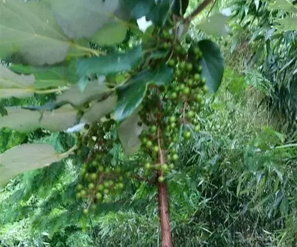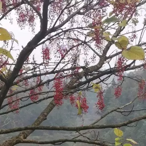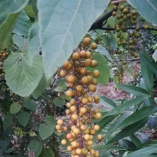 长果山桐子(Idesia polycarpaMaxim. var.longicarpaS. S. Lai):该变种和原变种的区别是:花梗通常比较长,长2.5-3.5厘米;成熟果实通常较大,长1.5-2厘米,直径1.2-1.5厘米,椭圆状长圆形或倒卵形;叶片先端通常呈尾状。花期4-5月,果熟期10-11月。分布于中国广东、广西、江西等省区。生于海拔600-1200米的浅山区阔叶林中。