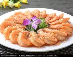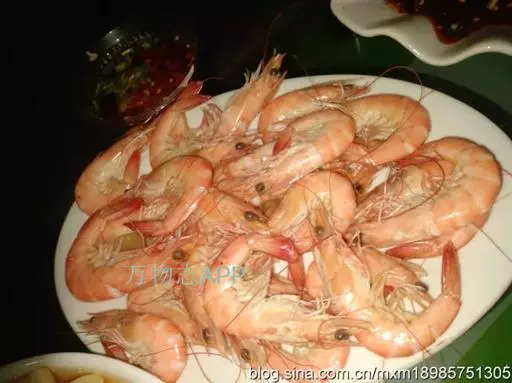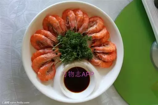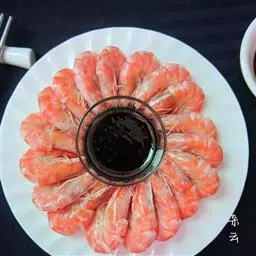 3、用旺火把清水烧开,下入鲜虾淖至熟捞起,控去水分上盘便可,跟味碟上桌。 [3-4]
