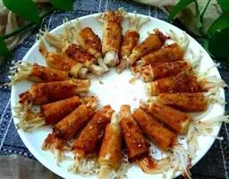 6.把烫的的调料汁放在虾的中间,吃的时候剥掉虾皮,蘸下调料就可以开吃了。