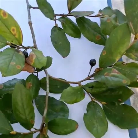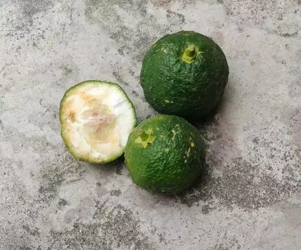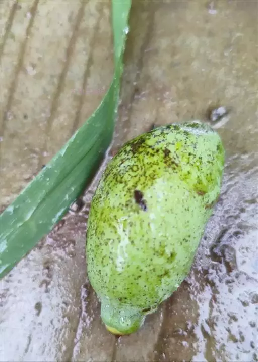 危害症状:受害果实初期产生轻微的圆形褐色疤状突起,后变褐色至浅紫色;果实成熟后,病斑联合,中心凹陷,果皮粗糙。该病害侵染果实后不影响其风味品质,但外观质量严重下降。在幼果期,如遇阴冷、潮湿天气,该病害发生严重。还可为害叶片,受害叶片出现棕色斑点,叶片皱缩;病斑进一步发展呈星形,中心穿孔。叶片受害经常发生于树冠顶部,且病斑多在叶背纹理内,病斑小,离散不连续,不易观察。叶柄和小枝病斑卵圆形,容易和介壳虫造成的斑点混淆。不同品种对该病的敏感性存在较大差异。
