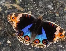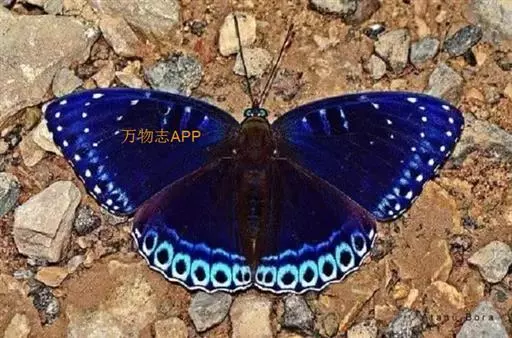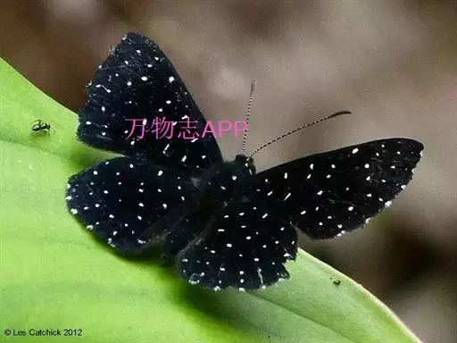 翅展55mm左右。翅面黑色,反面棕褐色。前翅外缘有1列整 齐的小白斑,其中2a室有2个,亚外缘有1列小白点,上述2列白点间有1条蓝色线。中室内有3条蓝白色短线,中室外侧也有数个小白点,后翅外侧也有数个小白点。后翅外缘有1列白斑,白斑内侧有1列黑点和蓝色带。反而斑点同正面,且更清晰。