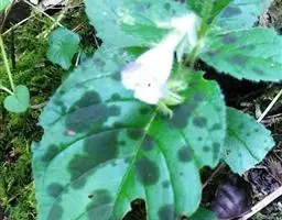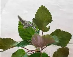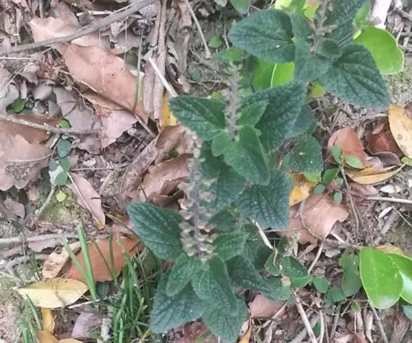 叶草质至近坚纸质,心状卵圆形或圆状卵圆形至椭圆形,长1.5-2.6(3)厘米,宽1.2-2.3厘米,先端钝或圆,基部圆形、浅心形至心形,边缘密生整齐圆齿,两面被微柔毛或糙伏毛,尤以下面为甚;叶柄长0.4-1.4(2.8)厘米,腹平背凸,密被微柔毛。