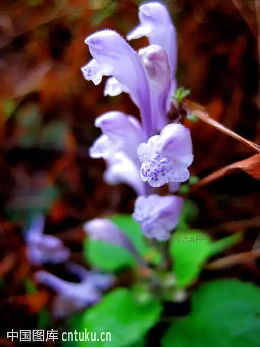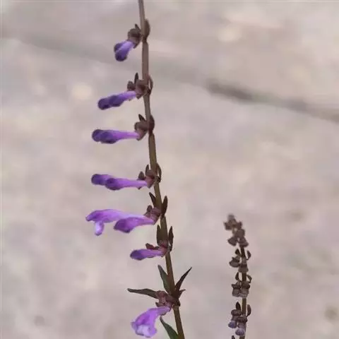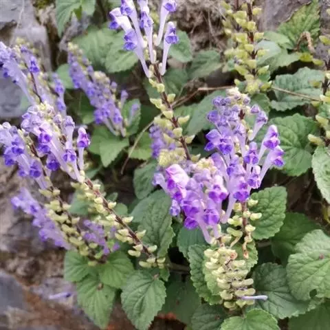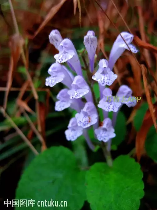 花对生,在茎或分枝顶上排列成长4-8(12)厘米的总状花序;花梗长2.5-3毫米,与序轴均被微柔毛;最下一对苞片叶状,卵圆形,长达1.7厘米,边缘具圆齿,其余苞片均细小,卵圆形至椭圆形,长3-6毫米,宽1-2.5毫米,全缘,无柄,被微柔毛。花萼开花时长约2.5毫米,被硬毛及微柔毛,果时十分增大,盾片花时高约1.5毫米,果时竖起,增大一倍。花冠蓝紫色,长1.4-1.8厘米,外疏被微柔毛,内面仅唇片被短柔毛;冠筒前方基部膝曲,其后直伸,向上逐渐增大,至喉部宽约4.5毫米;冠檐2唇形,上唇盔状,内凹,先端微缺,下唇中裂片圆状卵圆形,两侧中部微内缢,先端微缺,具深紫色斑点,两侧裂片卵圆形。雄蕊4,二强;花丝扁平,中部以下具小纤毛。花盘肥厚,前方隆起;子房柄短。花柱细长。子房光滑,4裂。