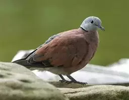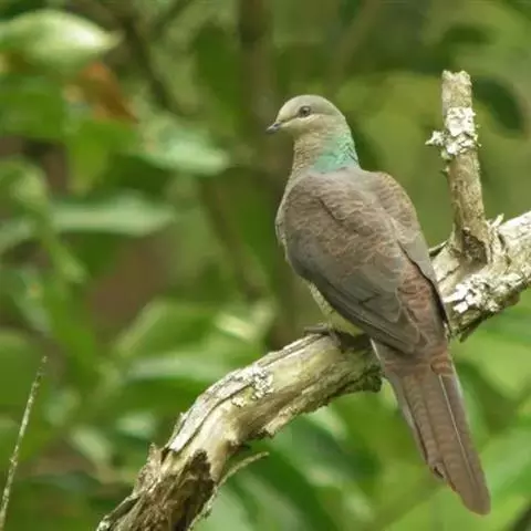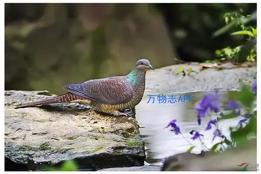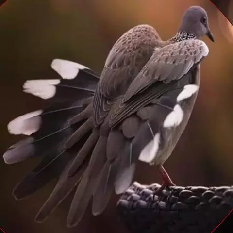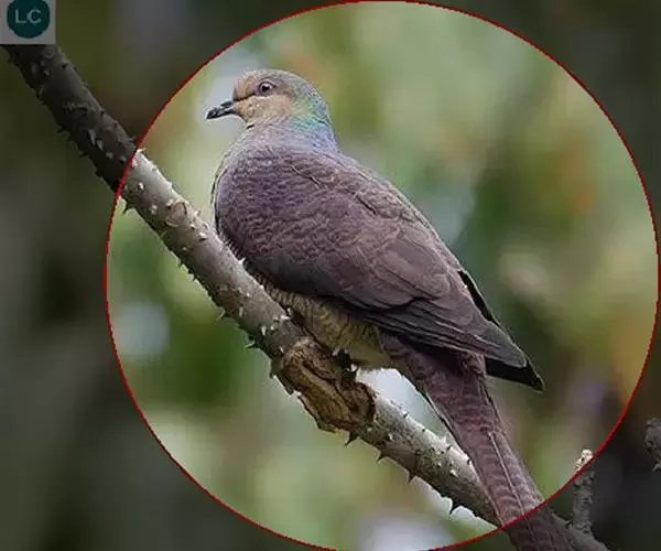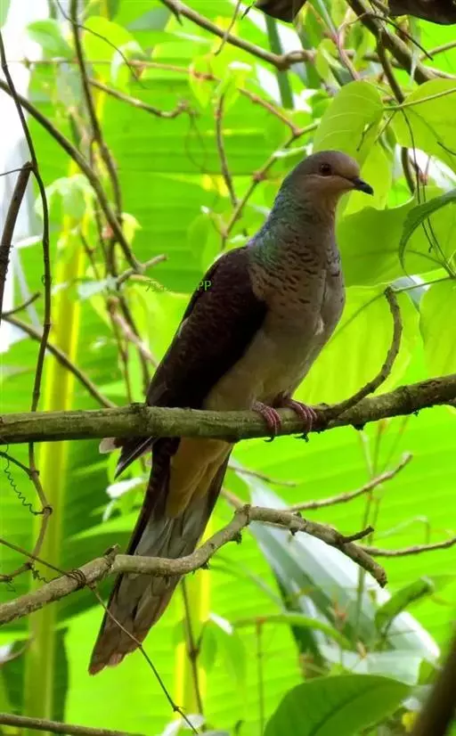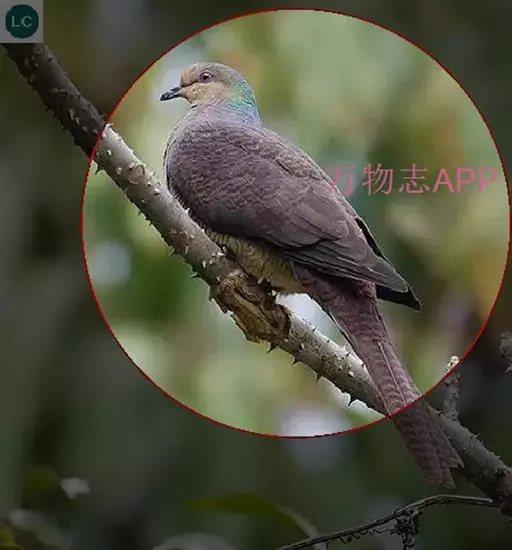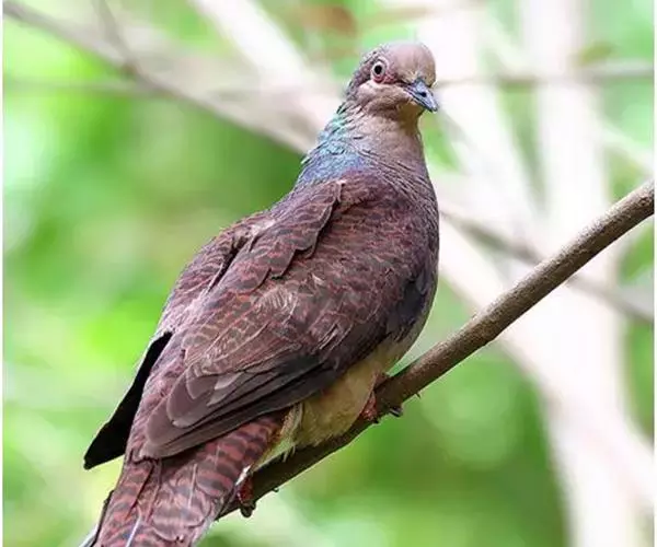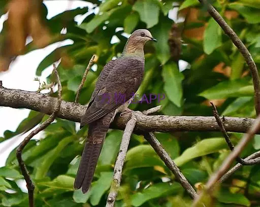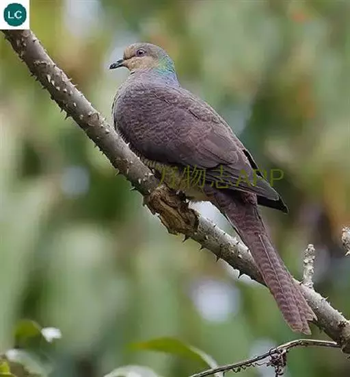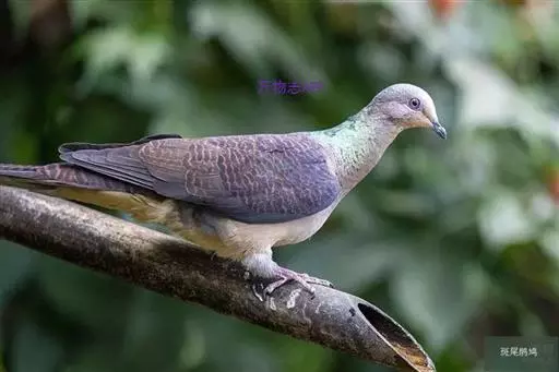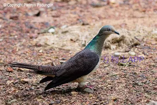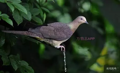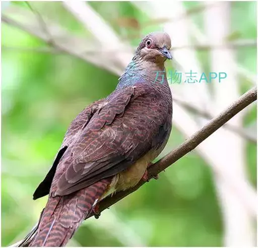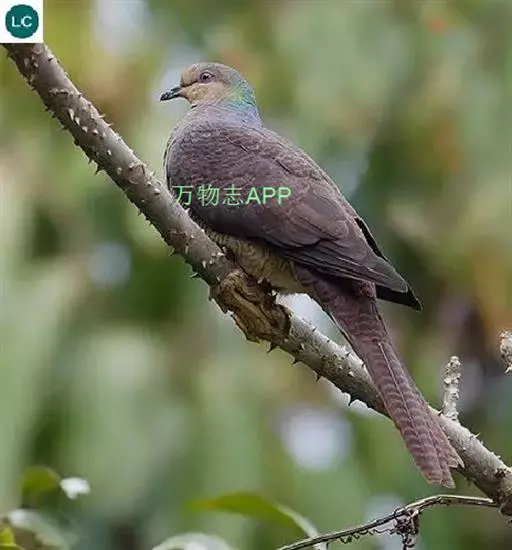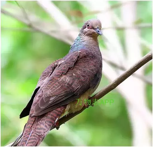 雌鸟和雄鸟相似,但上体少光泽,头顶与胸具黑褐色细横斑。尾羽较鸽类为长。